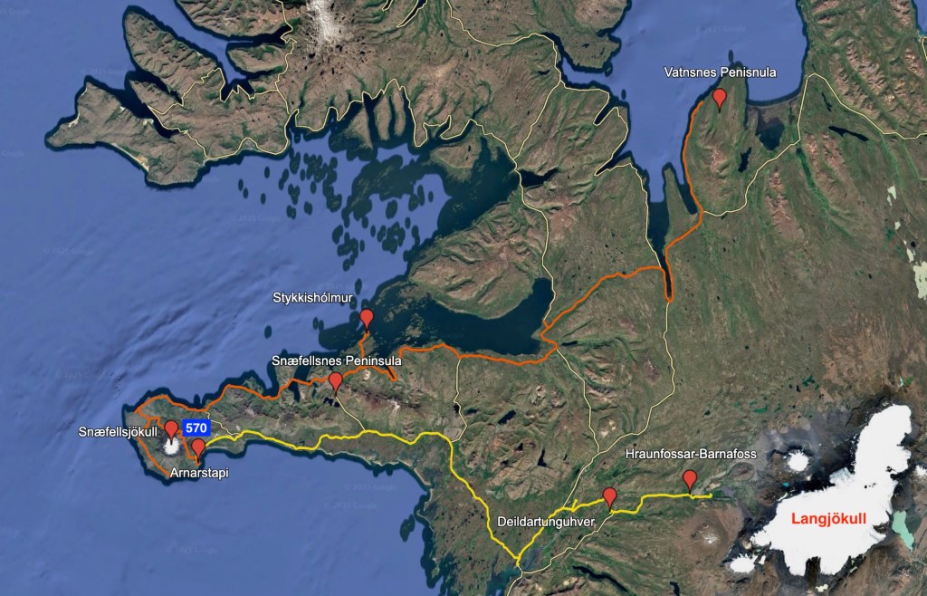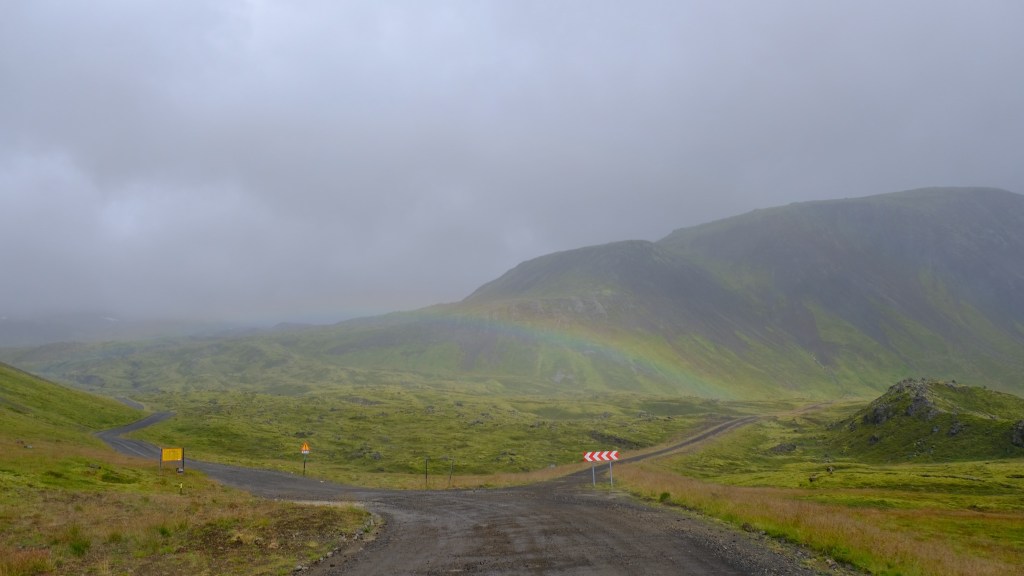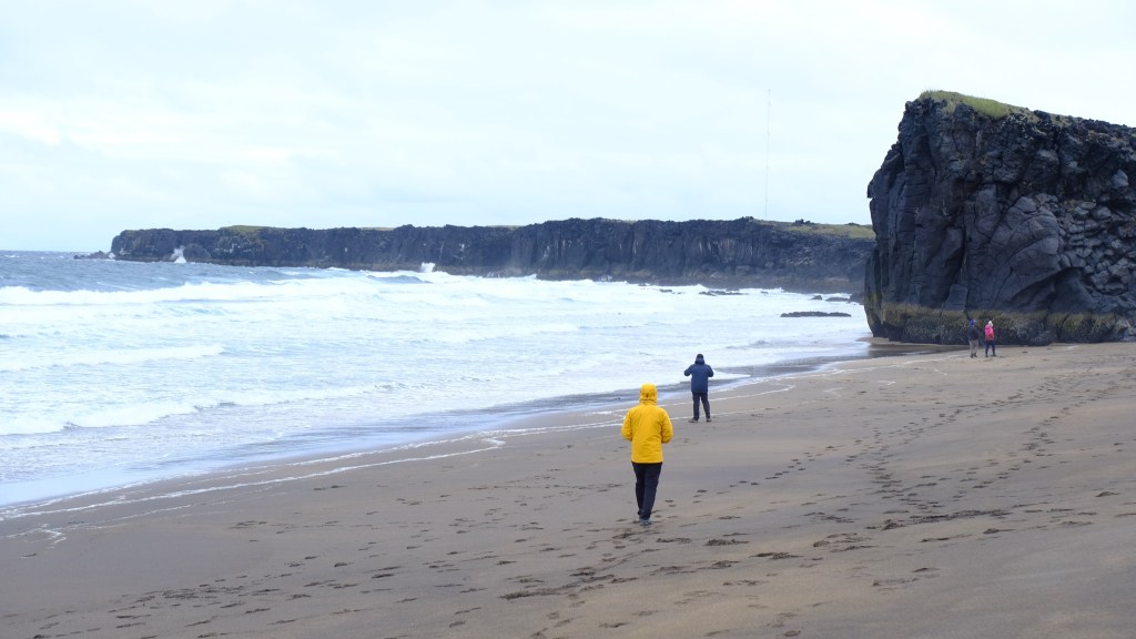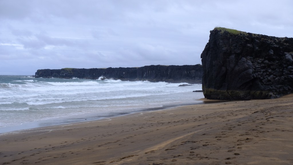 Da Arnarstapi prendiamo la pista 570 che costeggia il Snæfellsjökull, senza vederne la cima causa nubi basse e pioggerelina, per poi dirigerci alla spiaggia di Skarðsvík.