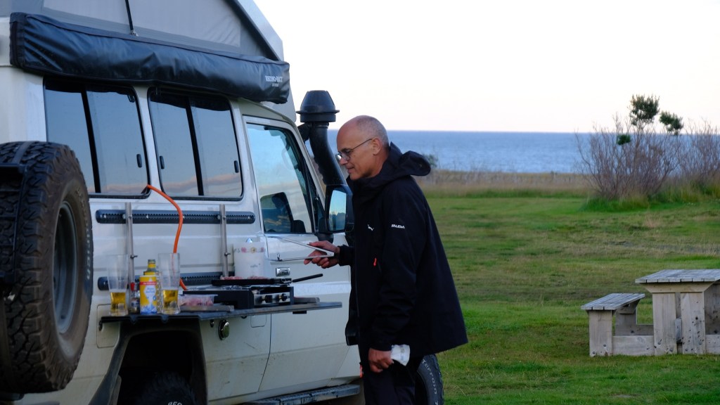 Grigliata in campeggio utilizzando il ripiano esterno di Carolina.