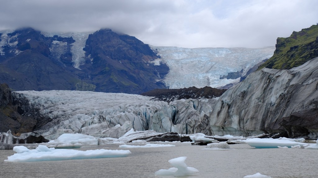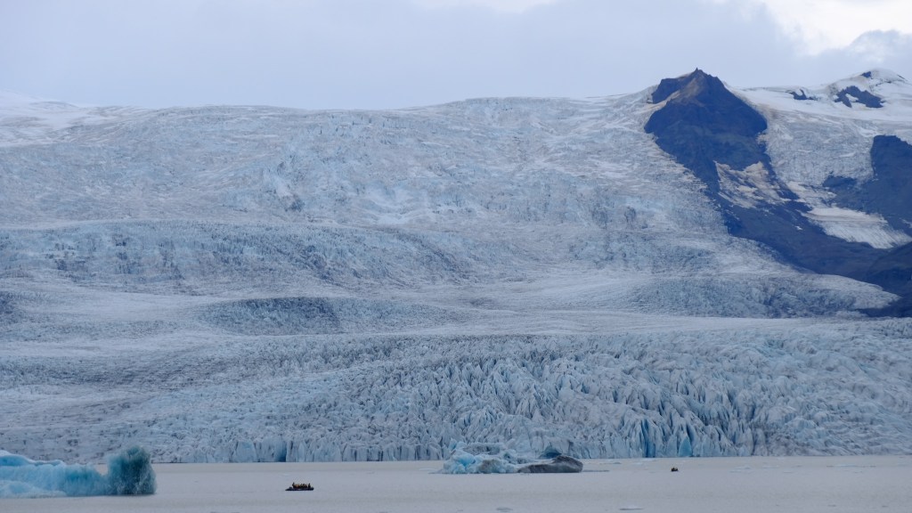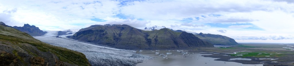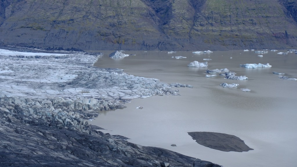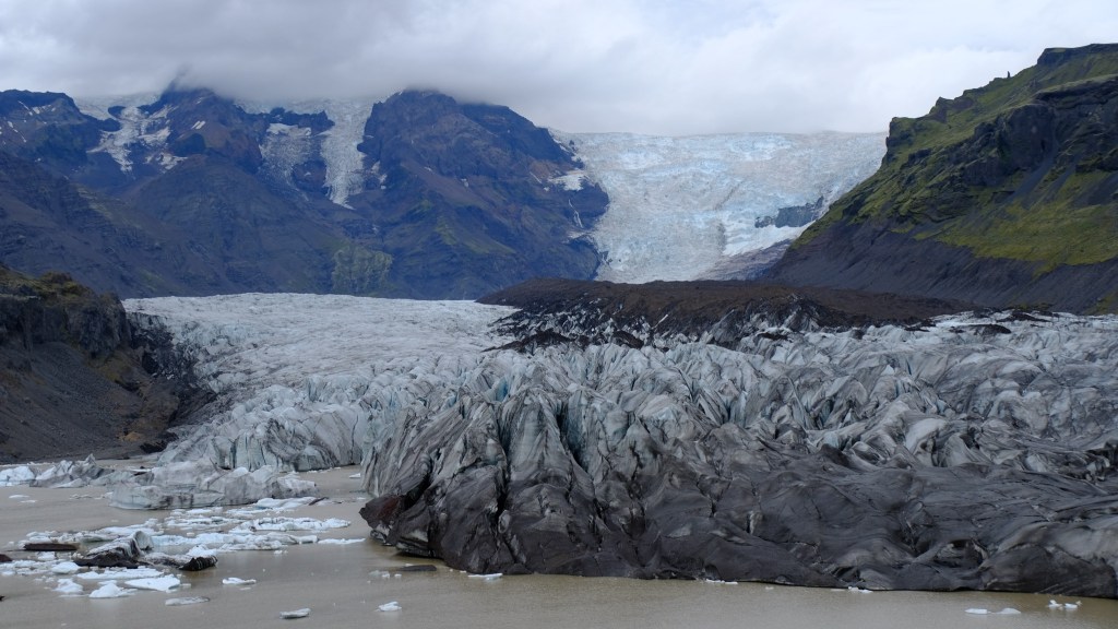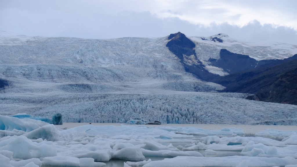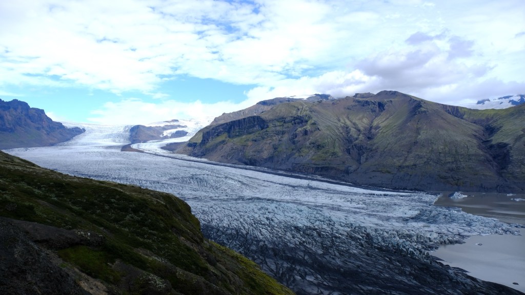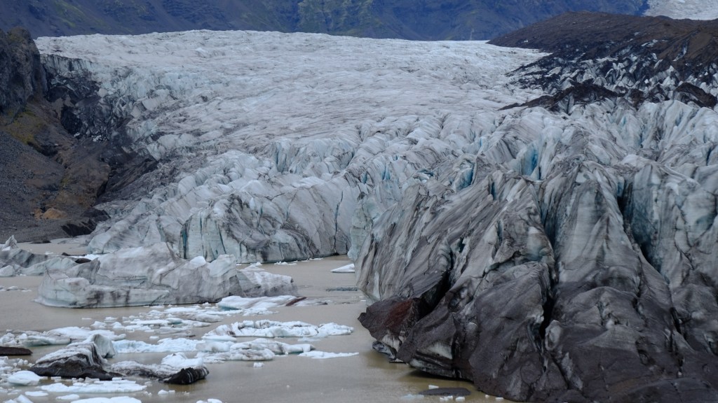 Il ghiacciaio Skaftafellsjökull è davvero imponente, il suo fronte termina in un lago con dei piccoli iceberg e sullo sfondo si staglia la cima del vulcano Hvannadalshnúkur (2110), la più alta d’Islanda.