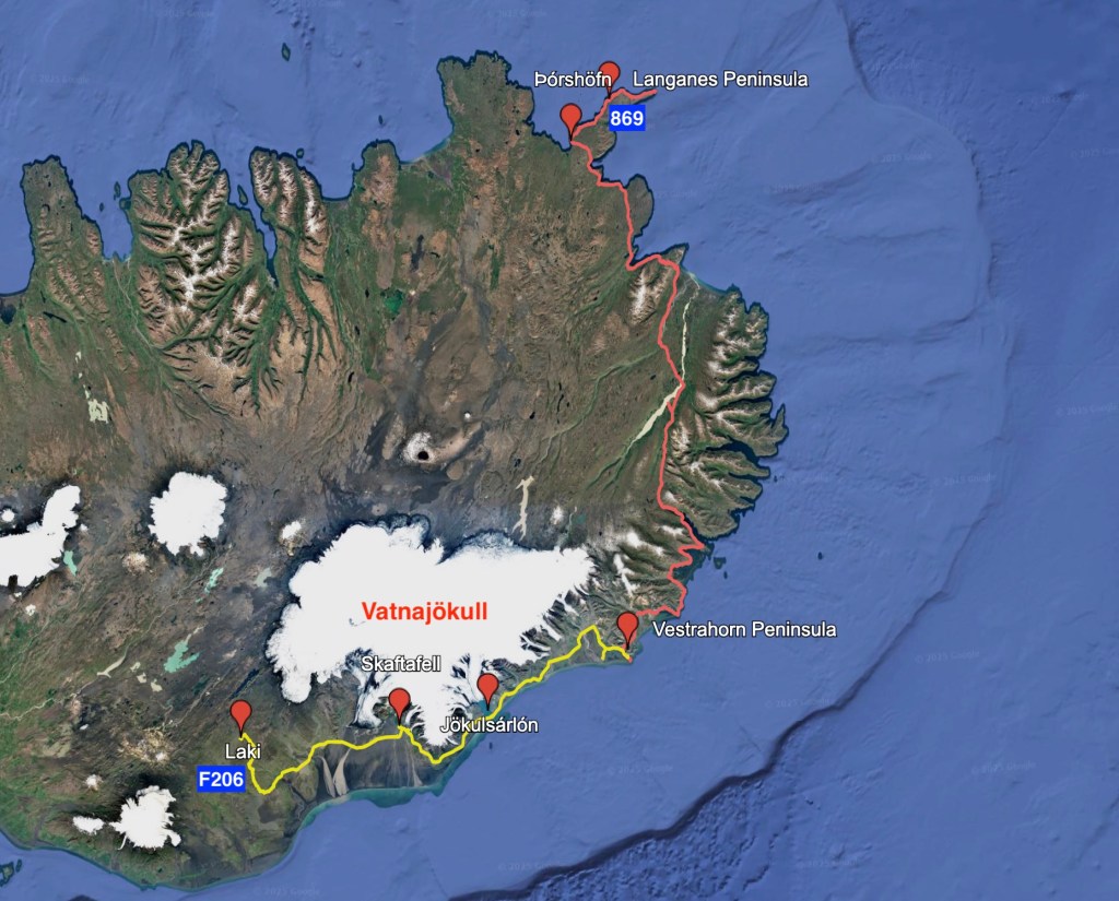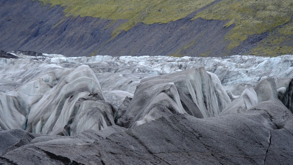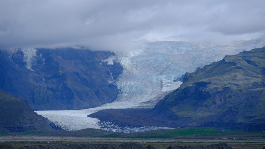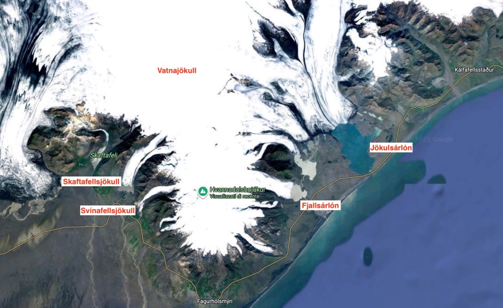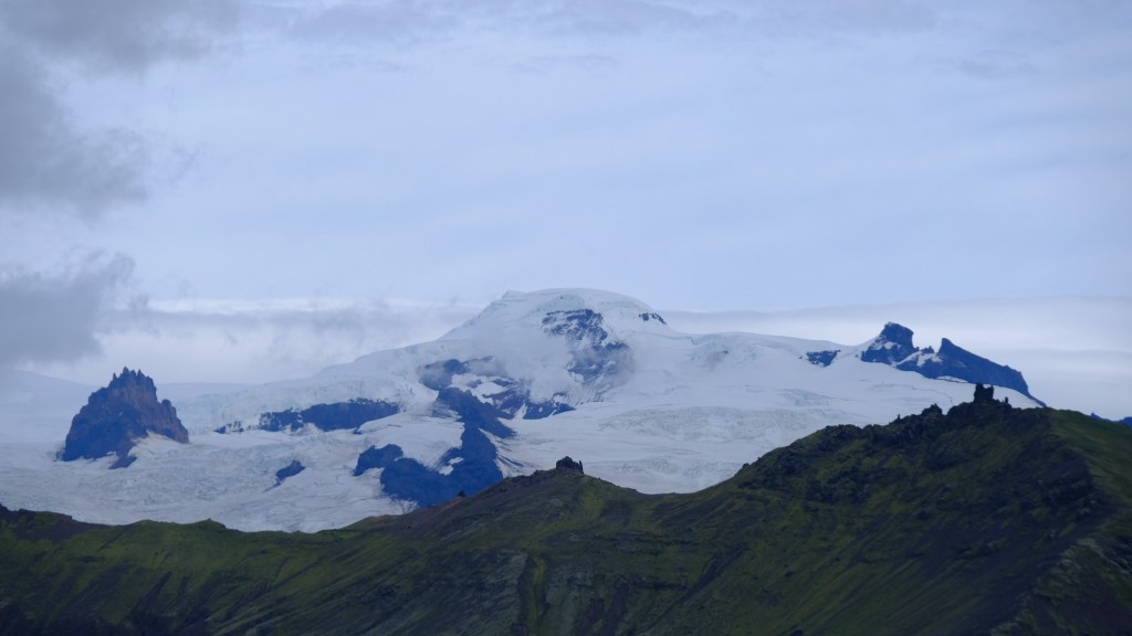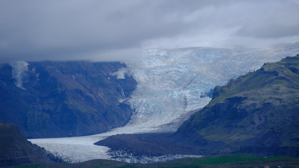 Il ghiacciaio Skaftafellsjökull è davvero imponente, il suo fronte termina in un lago con dei piccoli iceberg e sullo sfondo si staglia la cima del vulcano Hvannadalshnúkur (2110), la più alta d’Islanda.