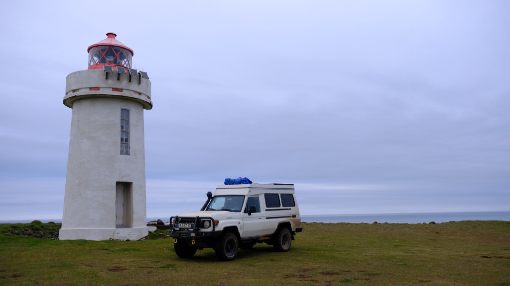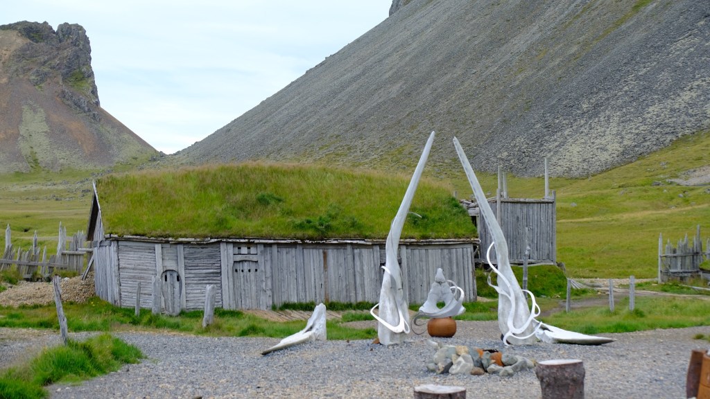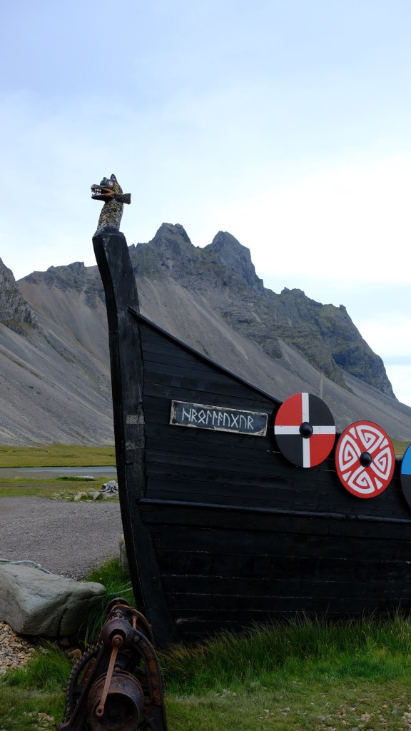 Prima di partire visitiamo il faro e la spiaggia nera adiacenti al campeggio. Vicino alla spiaggia c’è una ricostruzione di un villaggio vichingo con tanto di nave, il tutto abbastanza kitsch.
