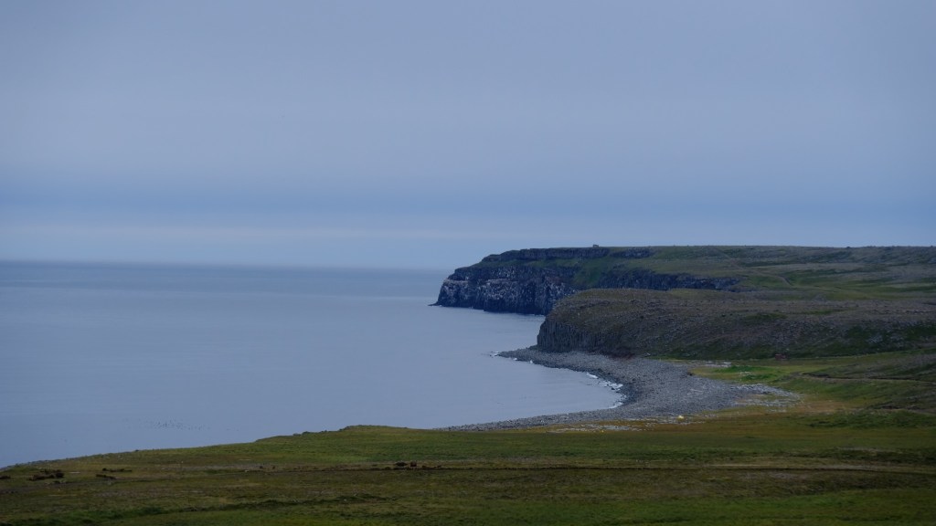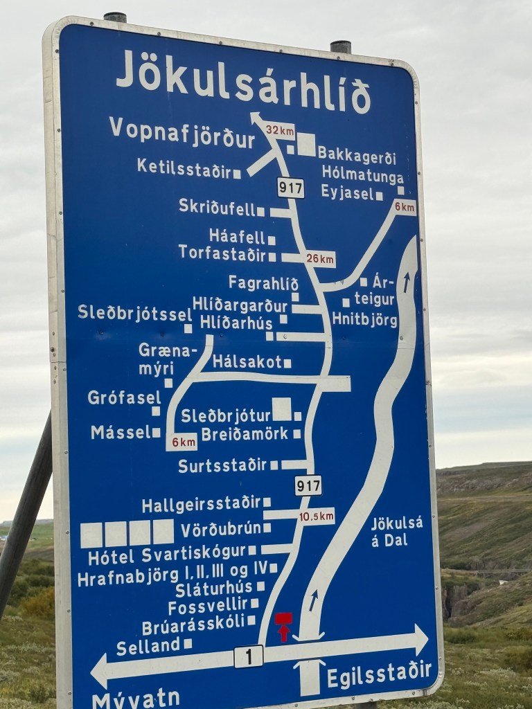 Torniamo per un breve tratto sulla Ring Road e poi imbocchiamo la 917 vero nord, sempre assistiti da un leggibilissimo cartello stradale in stile islandese, seguita dalla 85 fino a Þórshöfn.