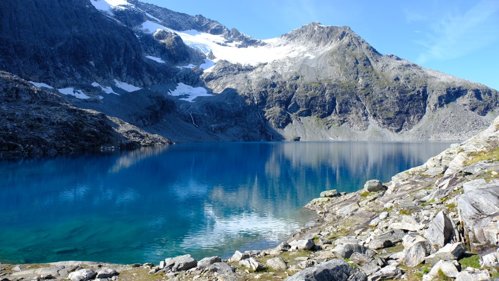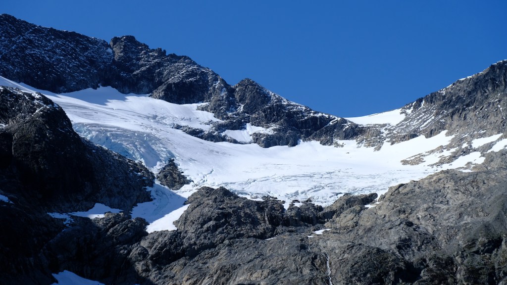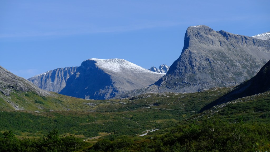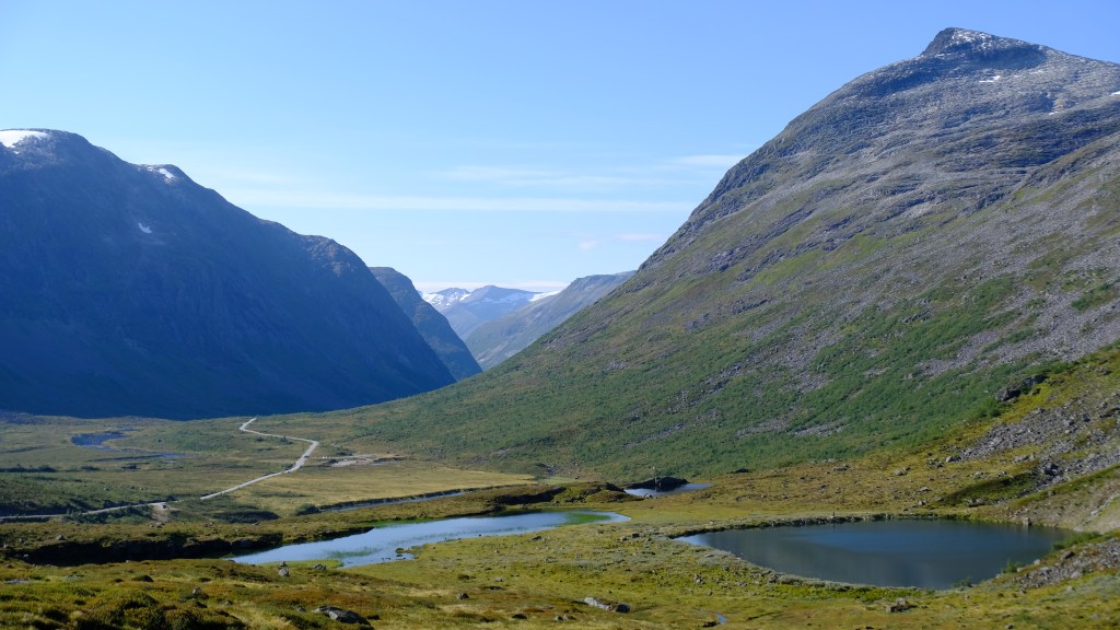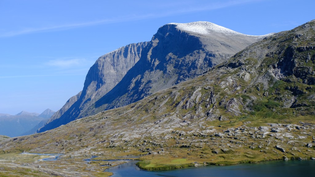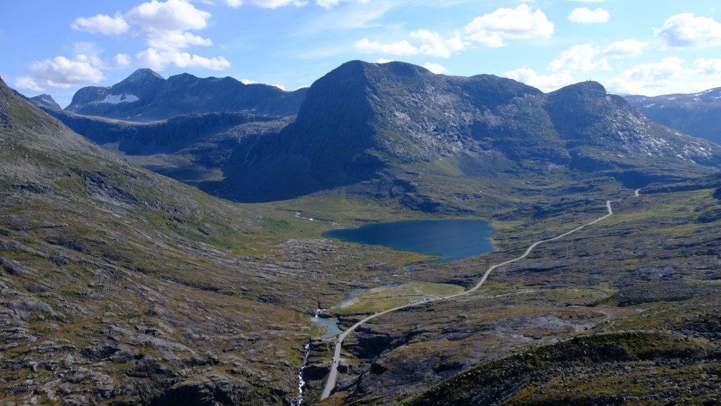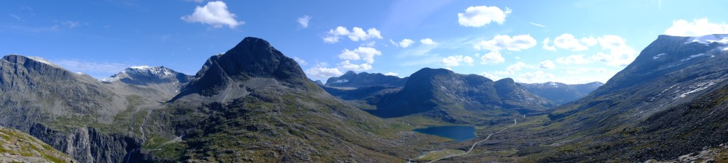La giornata è molto bella ed avvicinandosi a ci sono degli stupendi panorami sulle montagne brulle circostanti. Effettuo due trekking partendo dal Trollstigplatået, uno di circa 2.3 Km fino ad un punto panoramico sulla serie di tornanti, ed uno di 2.4 Km per salire al lago Bispevatnet, sotto un piccolo ghiacciaio, da cui si godono magnifiche viste sulle cime circostanti e sull’altopiano.