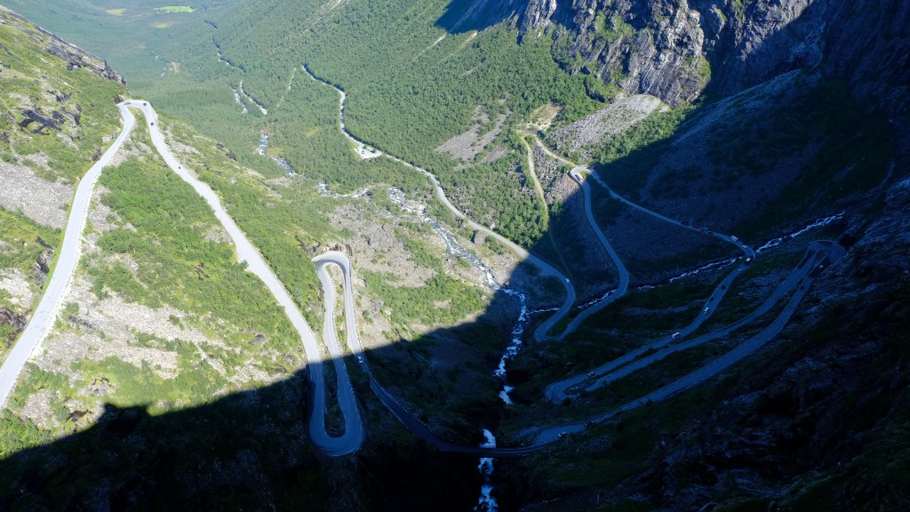 La discesa dal Trollstigplatået, a volte ad unica corsia, non presenta particolari difficoltà anche perché per mia fortuna non incontro pullman. Si passa vicino alla spettacolare cascata Stigfossen, con una caduta di 180 metri (in controluce nel pomeriggio).