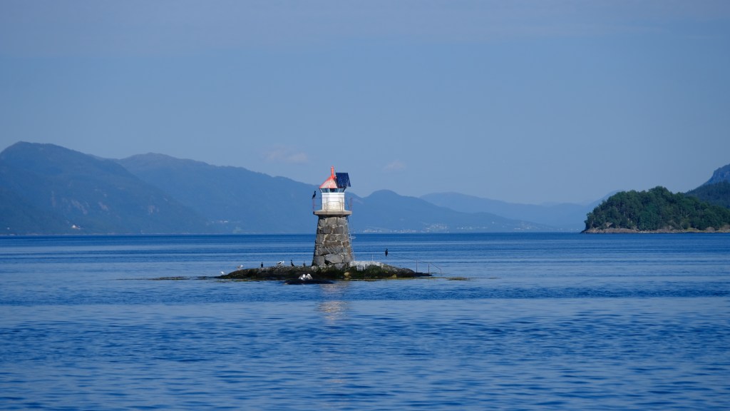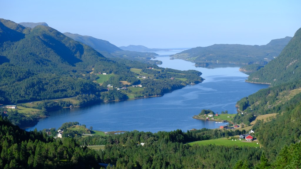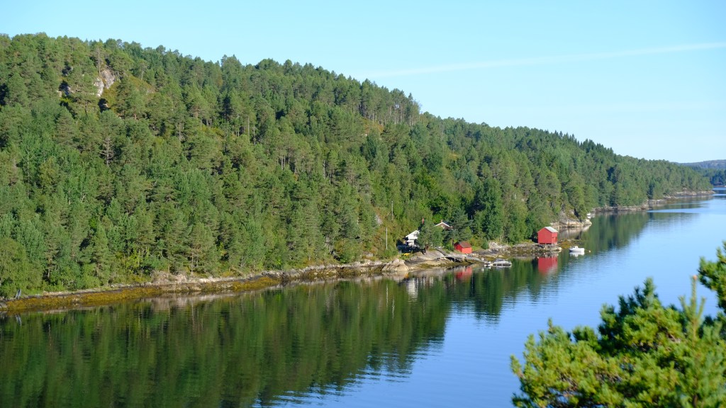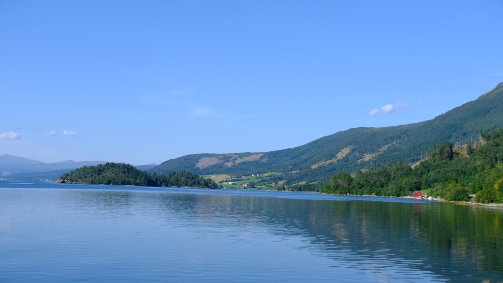 Data la vicinanza dal posto dove ho campeggiato, vado a vedere il fiordo Tresfjorden che si rivela nulla di che. Ripercorro al contrario la stradina che avevo fatto ieri sera per trovare un posto da campeggiare e ritorno sullo Storfjorden che percorro fino a Linge.