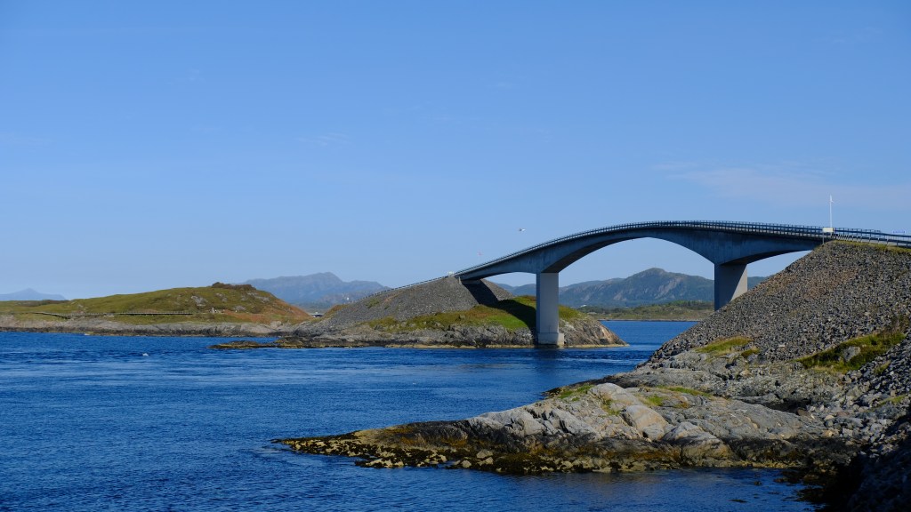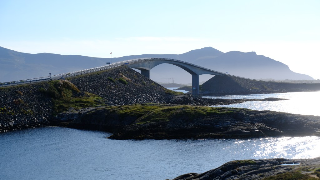 Da Åndalsnes seguo i fiordi verso nord fino a Moldes e qui prendo la 64, la Atlanterhavsveien (Strada Atlantica) col suo famoso ponte ricurvo (difficile da fotografare visto che è impossibile parcheggiare quando servirebbe) e le strade rialzate che collegano isolotti e scogli, offrendo viste spettacolari sul mare.