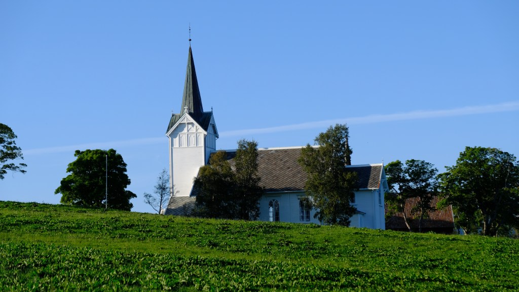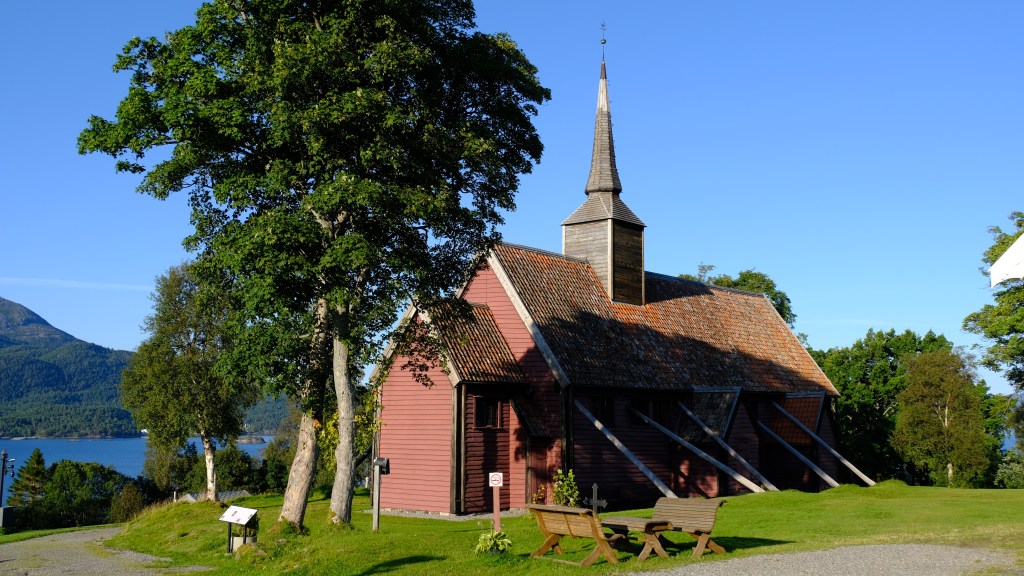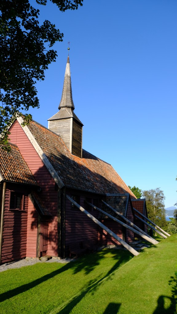 Continuo per la strada costiera 680 con dei bei paesaggi sui fiordi per poi giungere alla caratteristica chiesa rossa di Stemshaug.