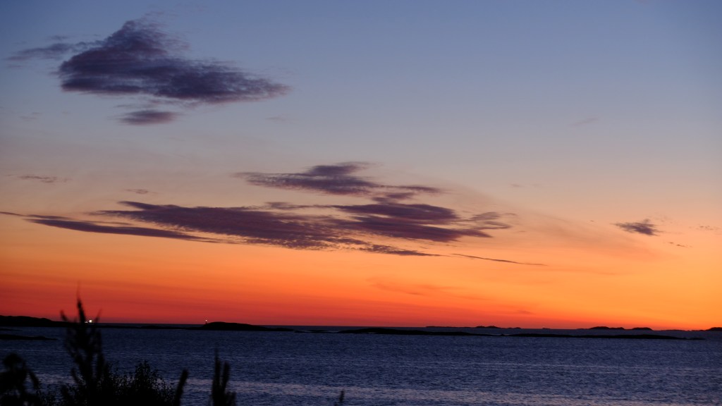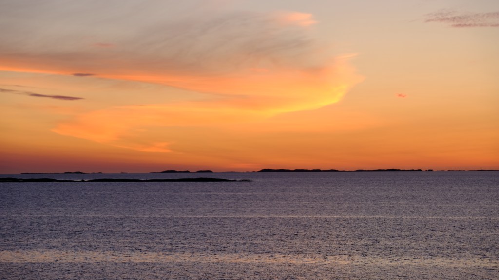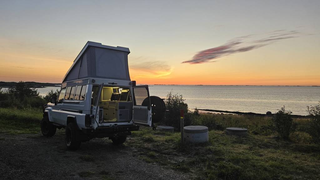 E’ già tardi per cui appena sbarcato cerco il primo posto che mi ispira per passare la notte. Giungo a Tustna e dei ragazzi del luogo mi dicono che c’e’ uno spot molto bello per campeggiare in riva al mare e di fregarmene del cartello di divieto di campeggio che è abusivo visto che la strada è pubblica. Accolgo il loro consiglio, anche perché tardi, ed il posto si rileva fantastico con un meraviglioso tramonto sul mare che dura ore.