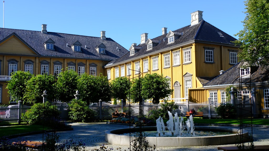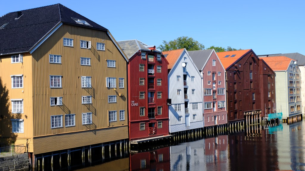Cammino poi per il centro passando dalla Stiftsgården, giallo edificio in legno residenza a Trondheim della famiglia reale, e dal quartiere Bakklandet, coi suoi magazzini in legno sul fiume.