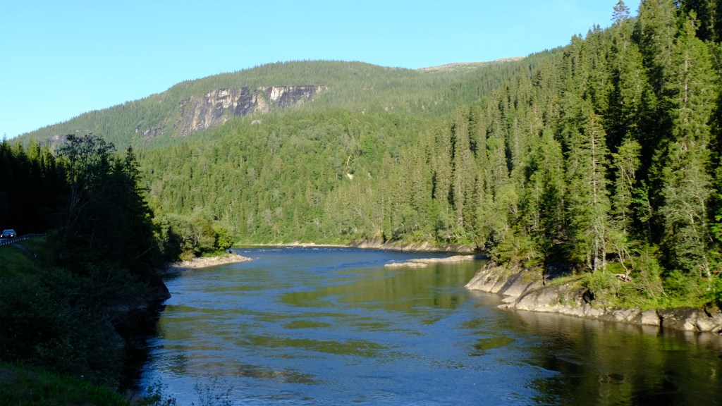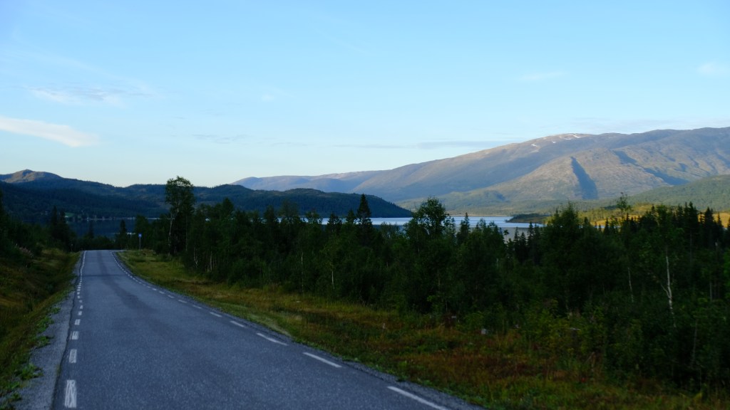Lasciata Trondheim mi immetto sulla E6 direzione nord. La strada è molto trafficata, con continui cantieri ed autovelox (speriamo bene) e mi vengono pensieri su chi me lo ha fatto fare ad andare fino a Capo Nord se questo è quello che mi aspetta. Per fortuna dopo Steinkjer la strada migliora, c’è meno traffico e si costeggiano dei laghi e dei fiumi.