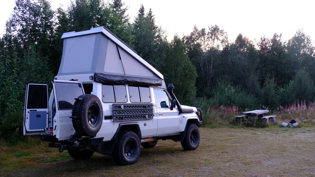 Una volta entrato nel Nordland, la regione più a nord della Norvegia, decido di fare una deviazione per una stradina secondaria, la Villmarksveien, che dalla mappa sembra costeggiare tutta una serie di laghi e mi fermo ormai tardi per campeggiare in uno spiazzo erboso giunto in prossimità del primo lago.
