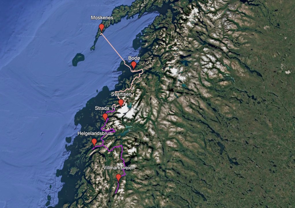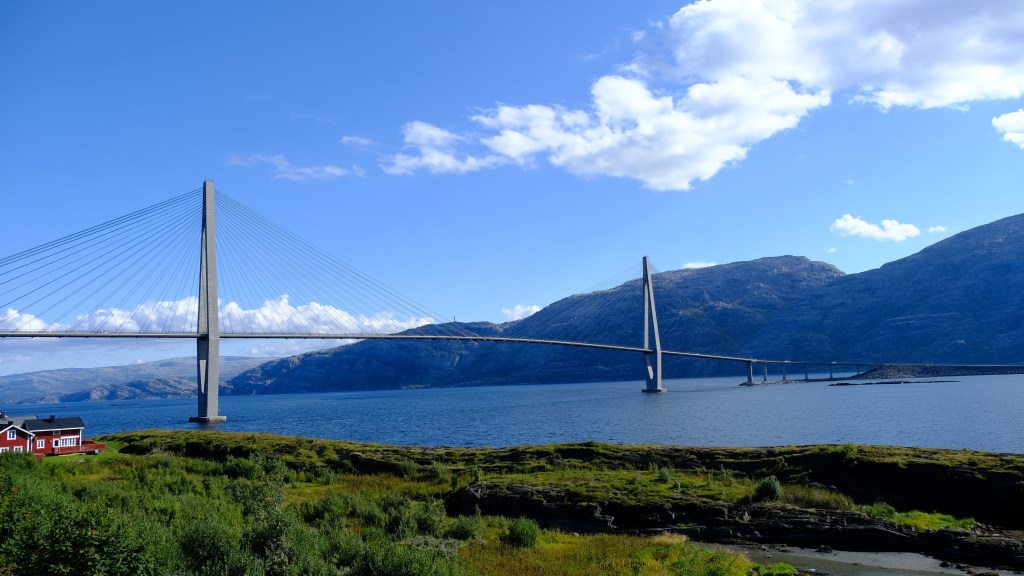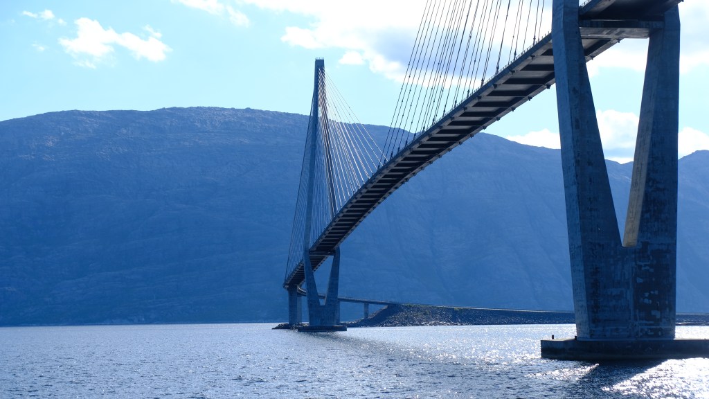 L’itinerario che ho scelto non è il più lineare ma mi permette di vedere più cose interessanti. Raggiunta più a ovest la strada turistica 17, ne percorro una parte verso sud giusto per vedere il famoso ponte Helgelandsbrua , anche questo ardita opera di ingegneria con curva e salita che percorro nei due sensi.