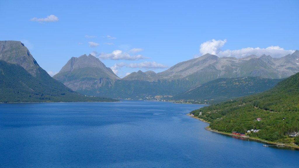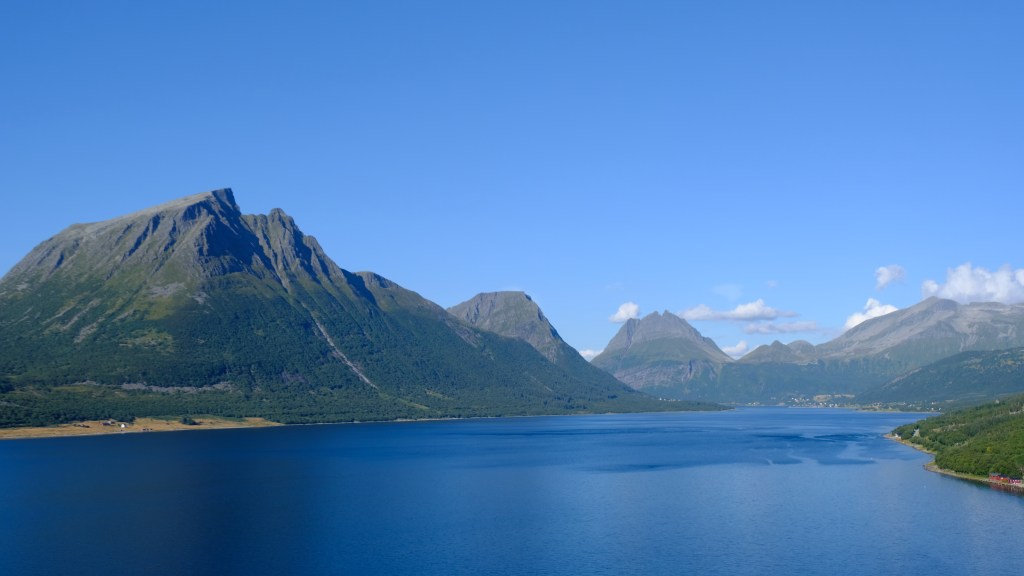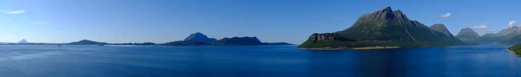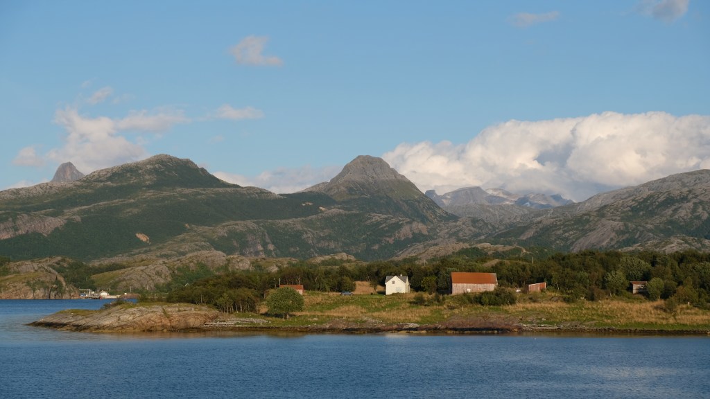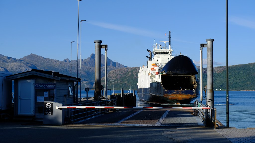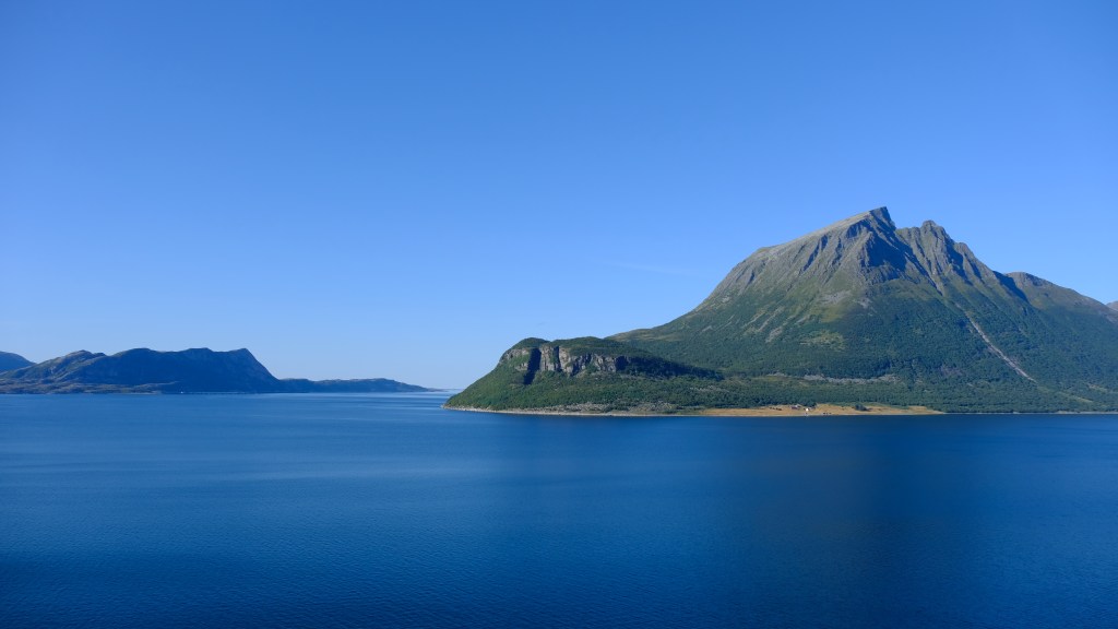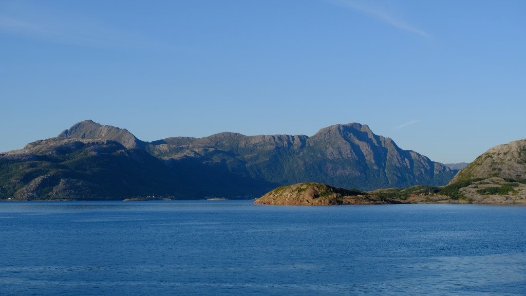 La strada costiera 17 è davvero bella, forse più bella della 64 fatta l’altro ieri, e bisogna prendere diversi traghetti. Il tratto di strada tra Nesna e Kilboghavn ed il traghetto tra Kilboghavn e Jektvik sono davvero meravigliosi, soprattutto fatti con la luce radente di tardo pomeriggio. Dal traghetto si vedono le montagne del parco nazionale di Saltfjellet-Svartisen e si passa davanti al fiordo Melfjorden in corrispondenza dell’attraversamento del Circolo Polare Artico, 66 gradi e 33 primi Nord, con tanto di mappamondo commemorativo sulla costa, che oggi si attraversa in maglietta sul ponte del traghetto.