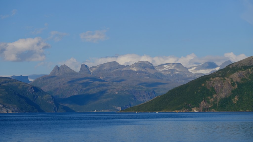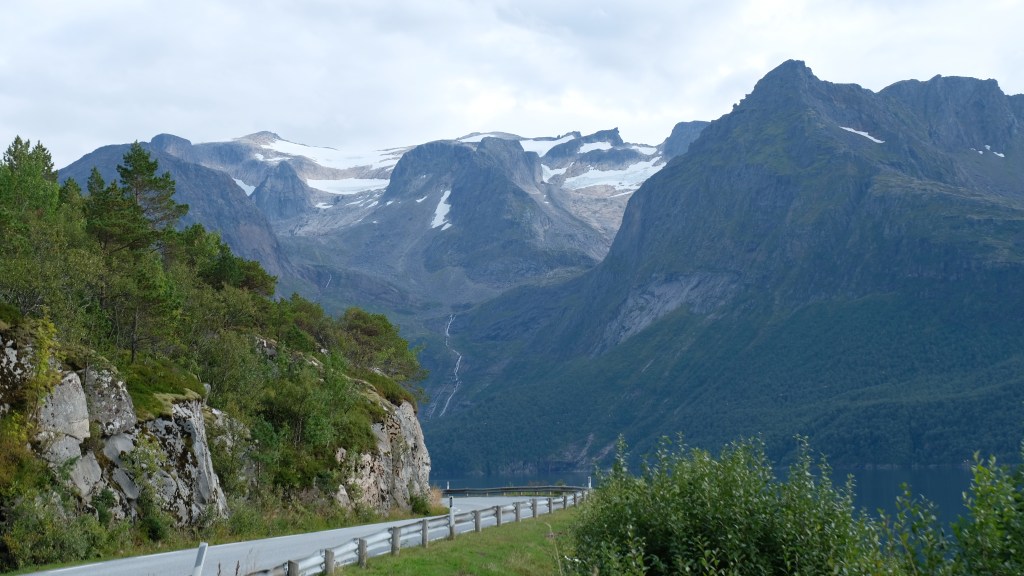 Mi metto in marcia sulla 17 con destinazione Bodø. Inizialmente i fiordi sono più aspri con montagne innevate e parecchi tunnel, poi diventano più morbidi. Sempre una bella strada anche se non più baciata dal sole di ieri.