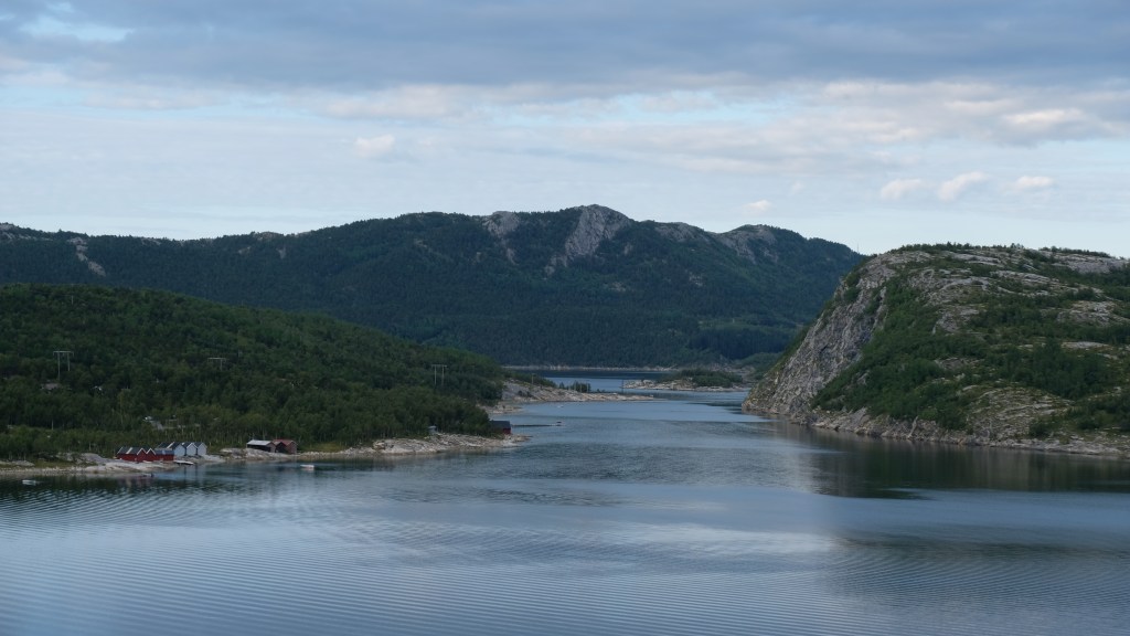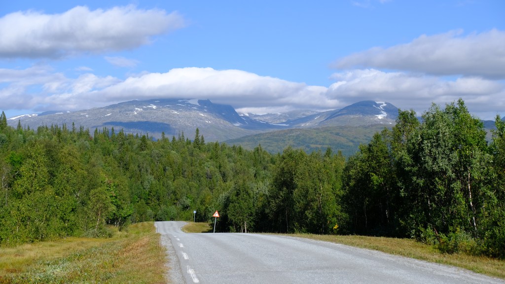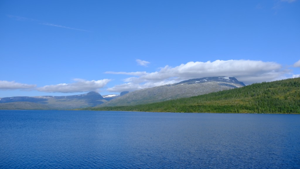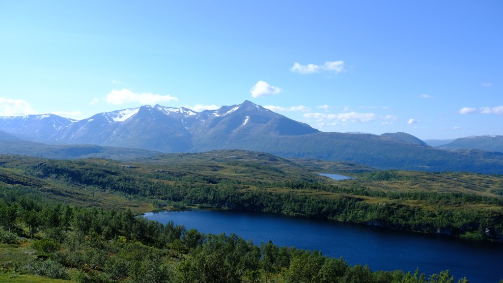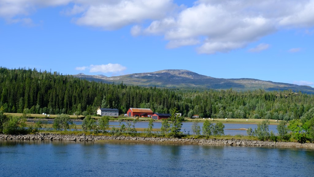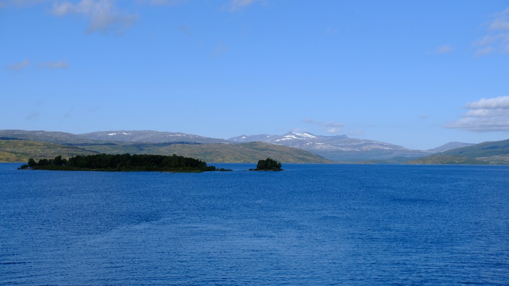 La scelta della variante su strada secondaria, la Villmarksveien, si è dimostrata azzeccata e percorro questa stradina costeggiando continuamente laghi in mezzo a boschi con sullo sfondo le montagne al confine con la Svezia fino a ricongiungermi alla E6.