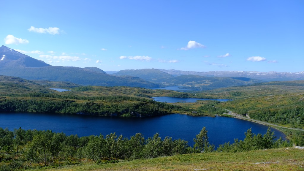 Evito un tunnel facendo la vecchia strada che porta al passo di Korgfjellet con belle vedute su laghi e cime dal punto panoramico che si raggiunge dal parcheggio del rifugio.