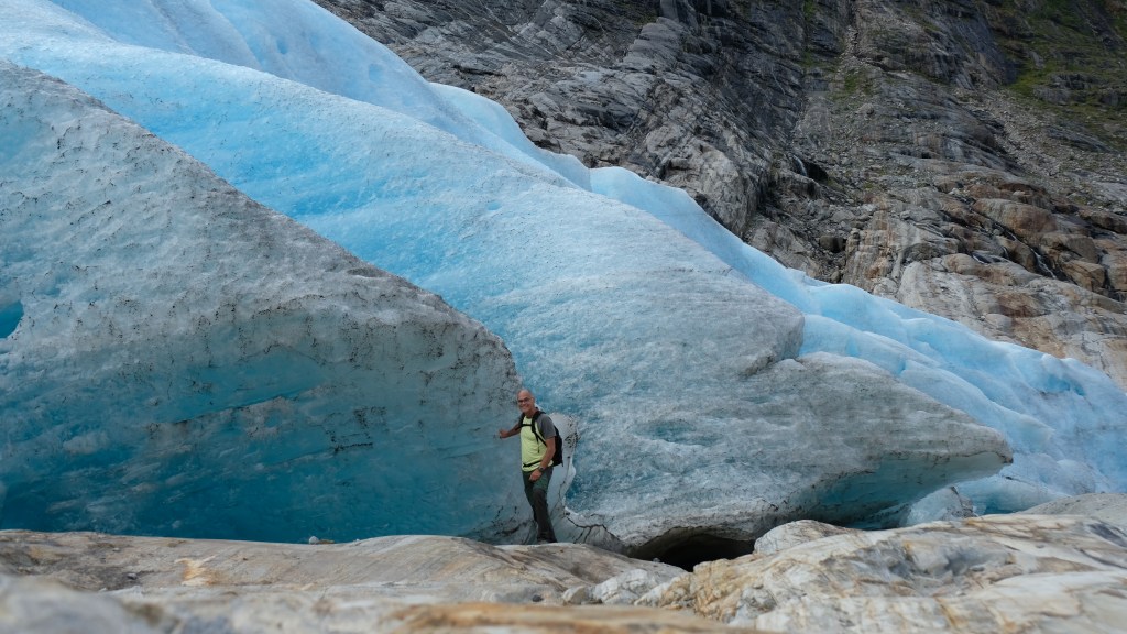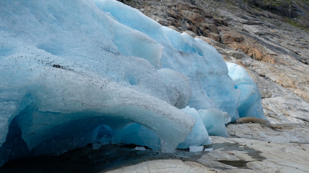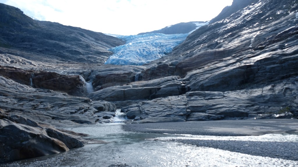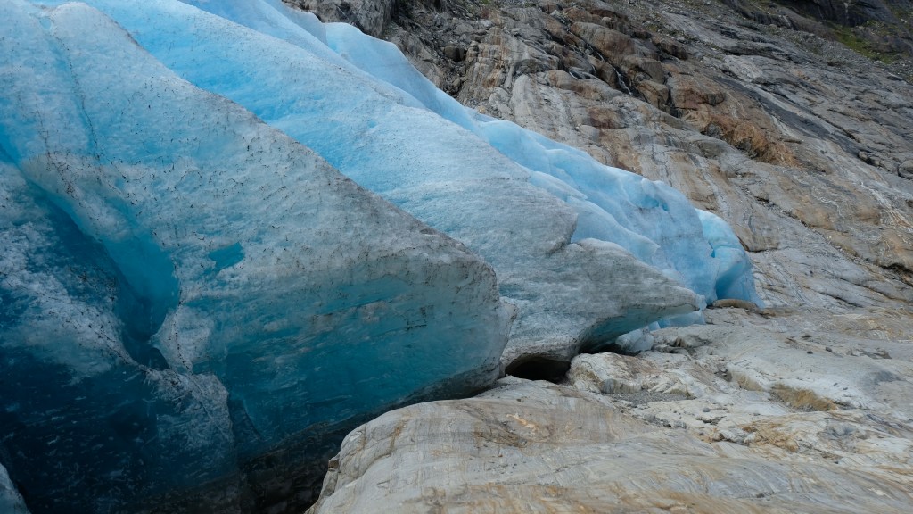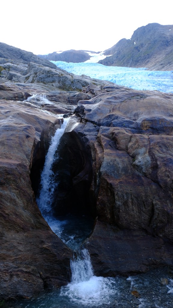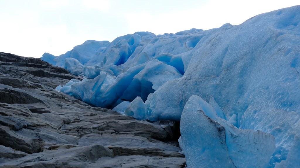 Dopo un po’ di attesa arriva il battello e giunti sull’altro lato noleggio una bicicletta per fare i 3,3Km fino alla partenza del sentiero. Cammino abbastanza spedito verso il fronte del ghiacciaio per sfruttare al meglio il poco sole che c’è, con tempo dato in peggioramento. Mi avvicino gradualmente passando da diversi punti panoramici camminando sulla morena del ghiacciaio ed una volta giunti al fronte è veramente emozionante. Qui il ghiaccio azzurro è appoggiato alle rocce e le formazioni di ghiaccio sono impressionanti. In lontananza vedo un gruppo di alpinisti che stanno camminando sul ghiacciaio, un po’ li invidio.