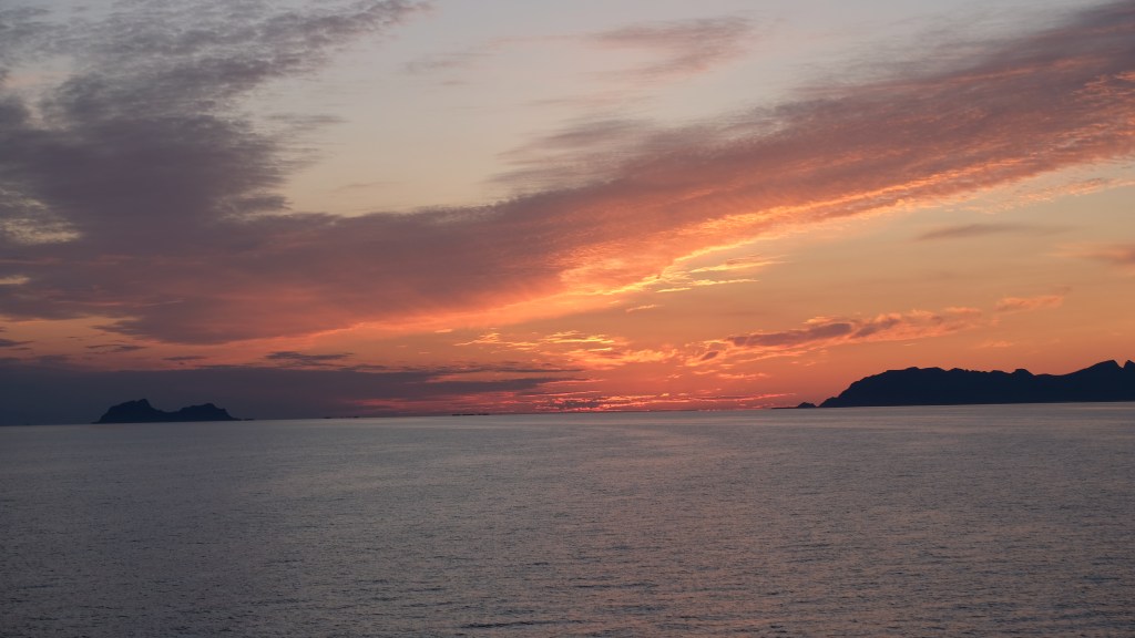 Mezz’ora dopo che è salito su Carolina già ci imbarchiamo sul traghetto per Moskenes, nelle Isole Lofoten (circa tre ore di navigazione), dato che a Bodø avevamo poco a che fare. Arrivo alle 22:00. Tramonto con vista sulle isole.