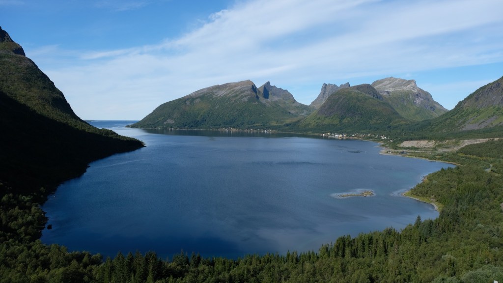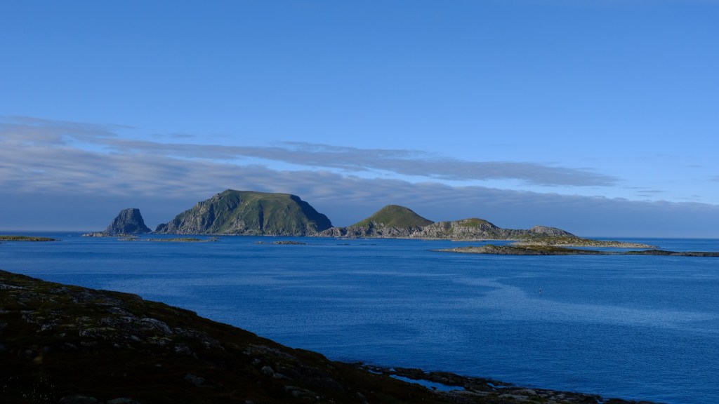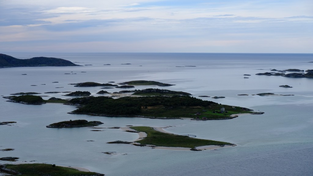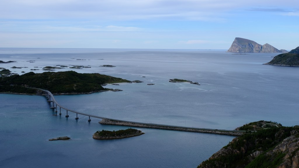 Prendiamo un secondo traghetto tra Botnhamn e Brensholmen e subito dopo effettuiamo una breve passeggiata fino al belvedere sull’isola di Sommarøy collegata alla terraferma da un ponte e circondata da piccoli isolotti.