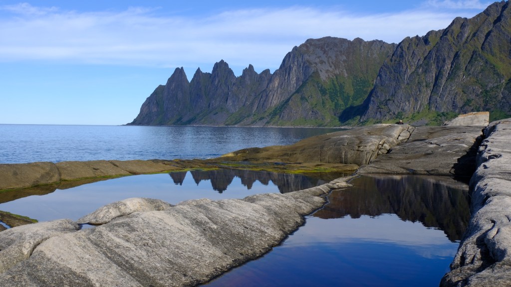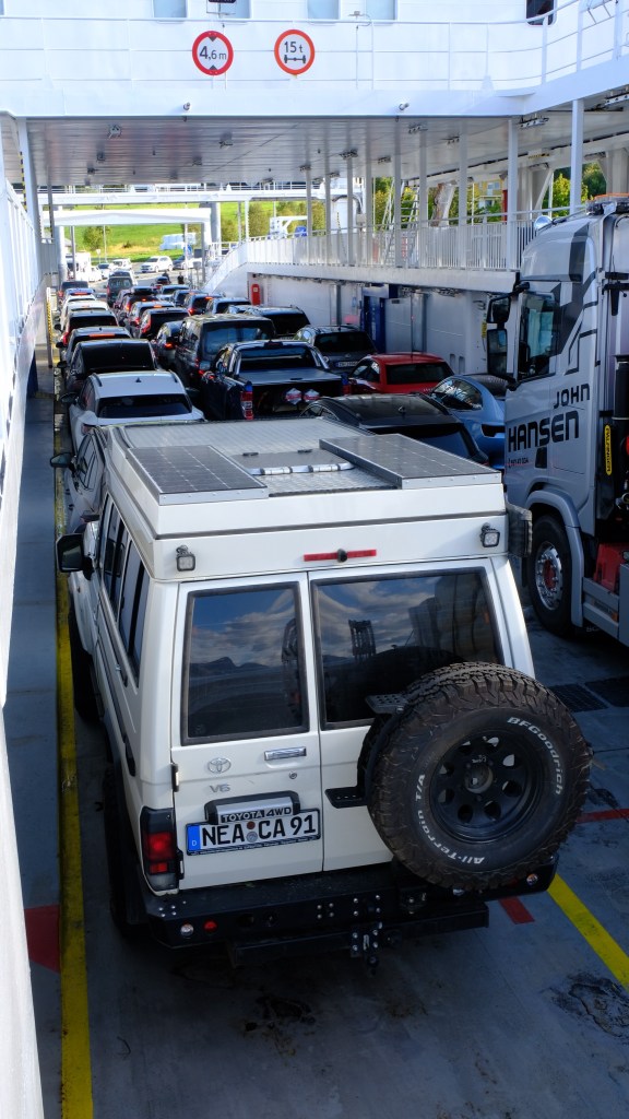 Sul traghetto conosciamo due sorelle spagnole che ci chiedono un passaggio e dato che la loro destinazione si trova lungo la 862, la strada che dobbiamo percorrere, le accomodiamo sulla panca dietro. Le accompagniamo fino a Fjordgård, alla base della passeggiata per il Senja, un monte a forma di vela.