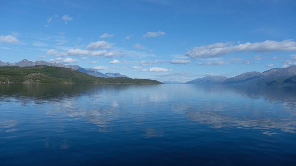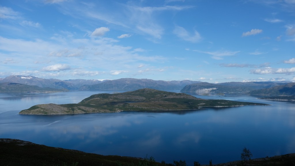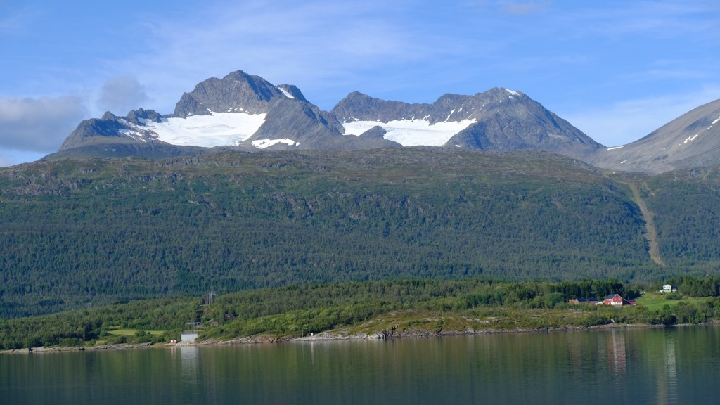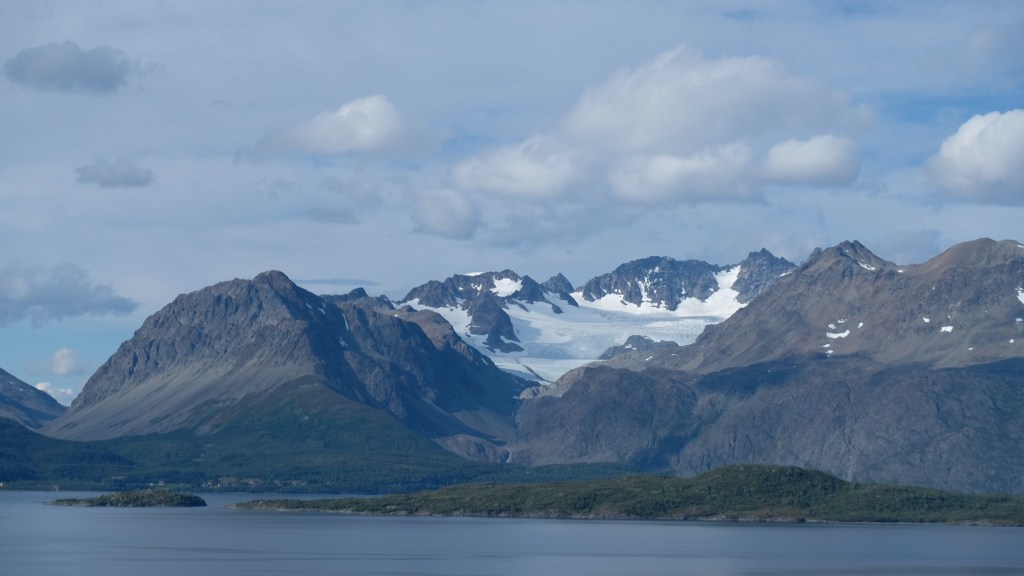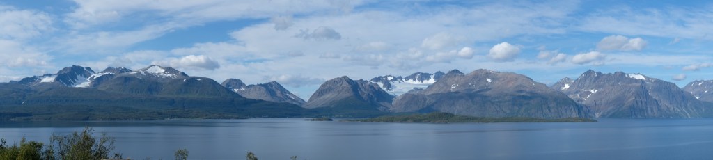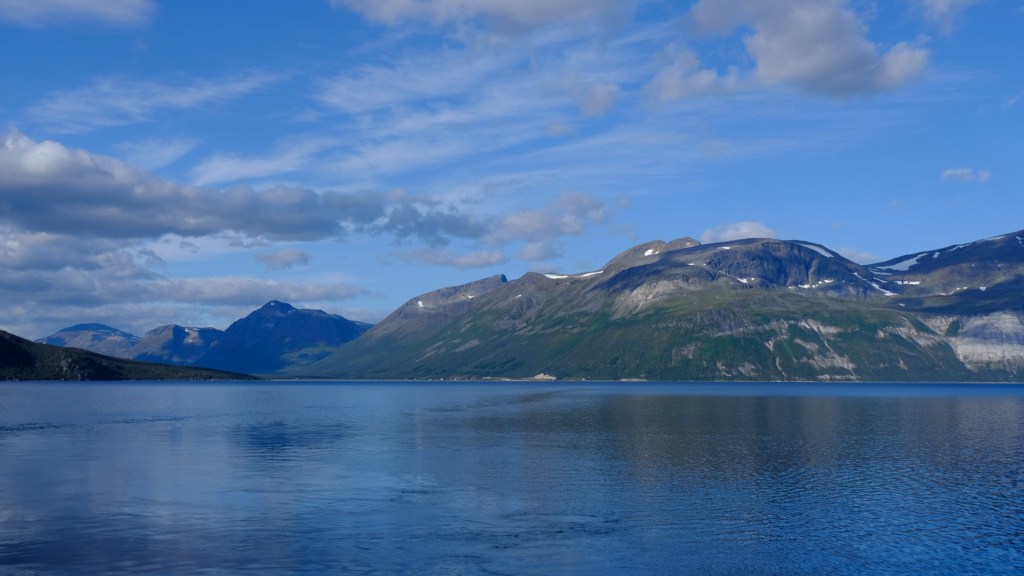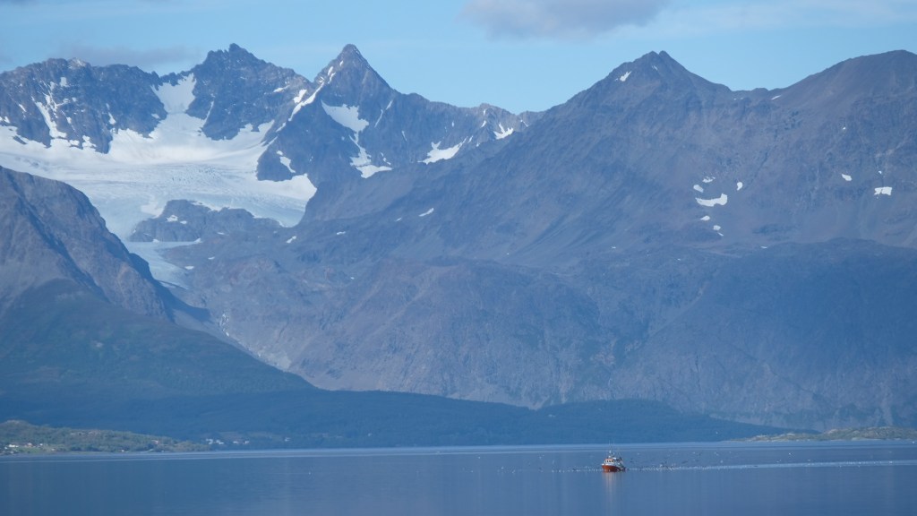 Da Tromsø prendiamo la E6 per poi imboccare la 91, più corta ma con due traghetti tra Breivikeidet e Svensby e tra Lyngseidet e Olderdalen. Dal secondo traghetto e dal tratto di E6 che ne segue, la vista sul fiordo e sui ghiacciai che si affacciano è molto suggestiva