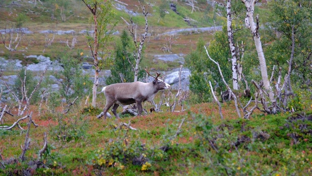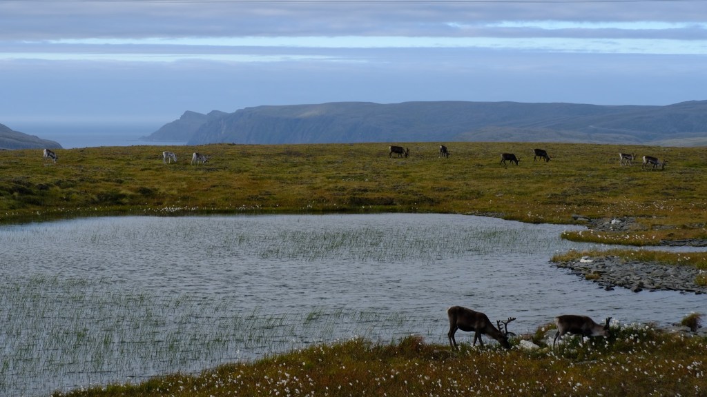 Ci dirigiamo verso nord in un territorio brullo e desolato privo di alberi fino a passare il tunnel per l’isola Magerøya, l’isola di Capo Nord. Primi avvistamenti di renne.