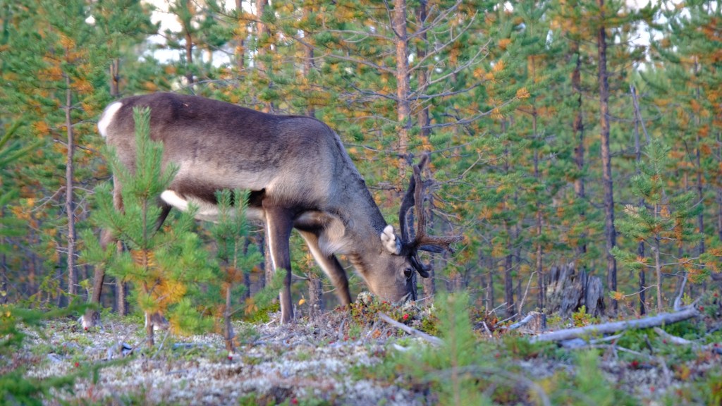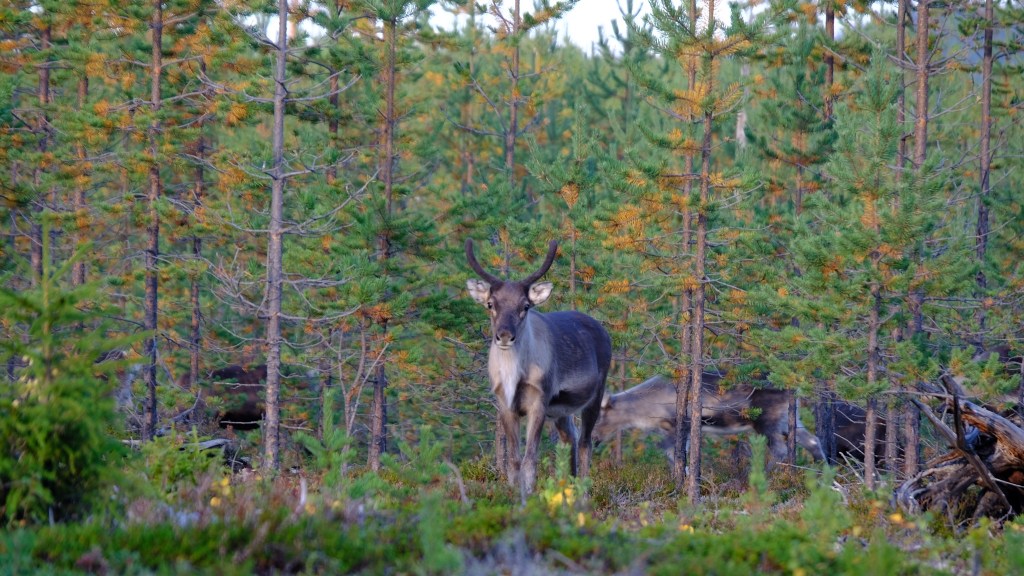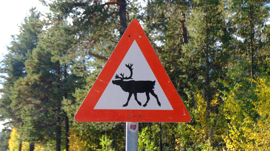 Ripercorriamo la breve pista secondaria da dove abbiamo campeggiato passando tra piccoli pini molto ravvicinati con branchi di renne che ci attraversano la strada.