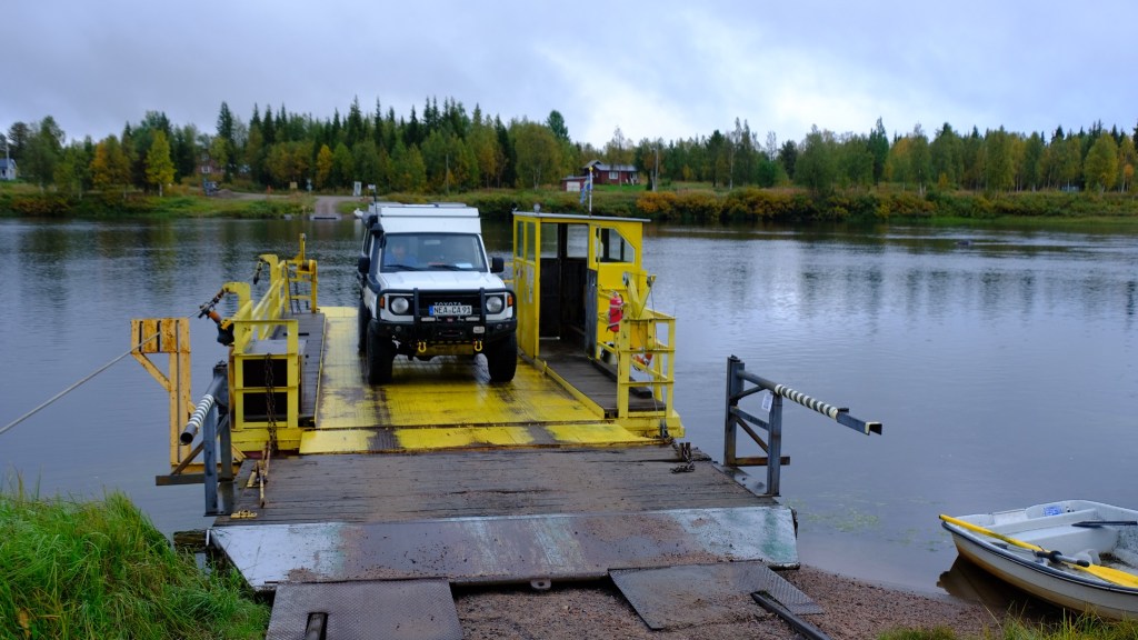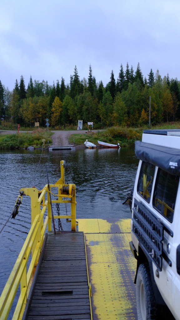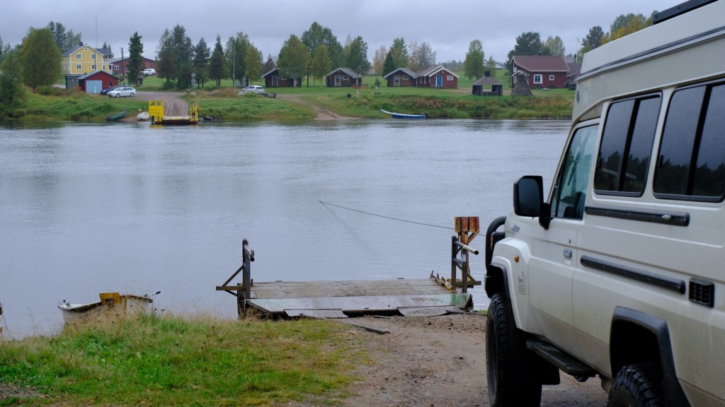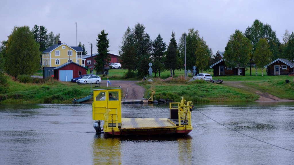 Dopo un trasferimento su asfalto imbocchiamo le prime piste per giungere a Lainio dove per attraversare il fiume c’è un piccolo traghetto collegato ad una fune. Come da istruzioni su di un cartello chiamiamo Nikolas che ci fa attraversare.