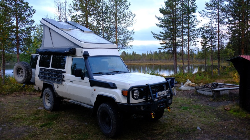 Lasciato Jokkmokk imbocchiamo una pista secondaria che ci porta ad un bello spiazzo su di un lago dove campeggiamo.