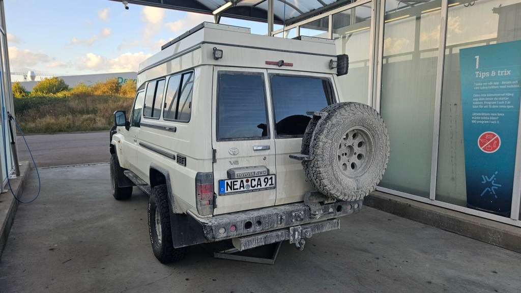 Mi distacco dal TET appena prima di Göteborg, al borgo di Kungälv con le sue case di legno e la sua fortezza. Qui gonfio le gomme e tolgo il blocco ai mozzi delle ruote anteriore da usarsi per l’innesto delle quattro ruote motrici; da ora in poi solo due ruote motrici, sigh.