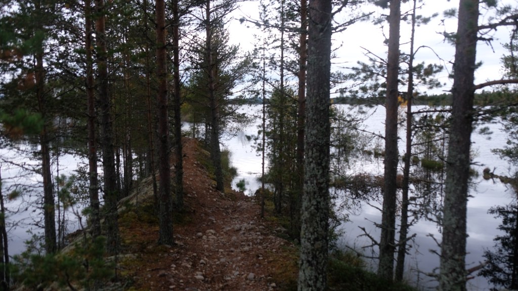 Seguendo il percorso si giunge ad un tratto su di uno stretto dito di terra che si incunea in un lago. Lo seguo per un po’ fino ad arrivare ad uno spiazzo da cui la pista continua più stretta.