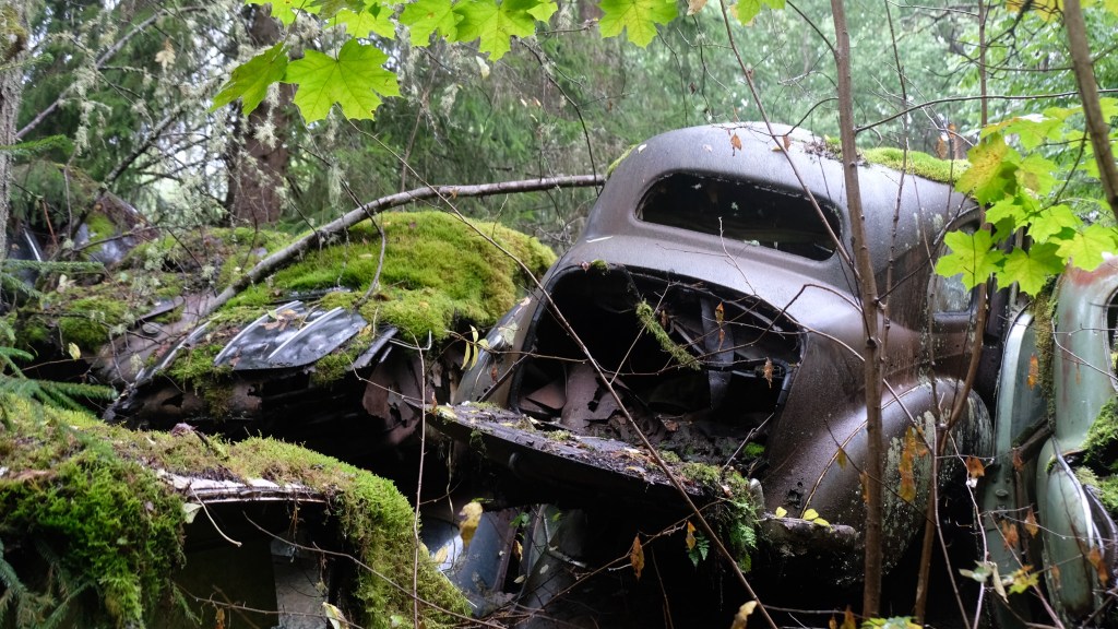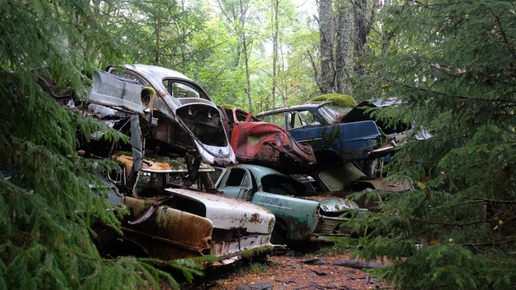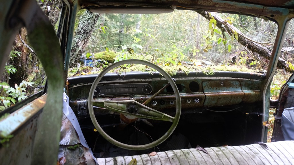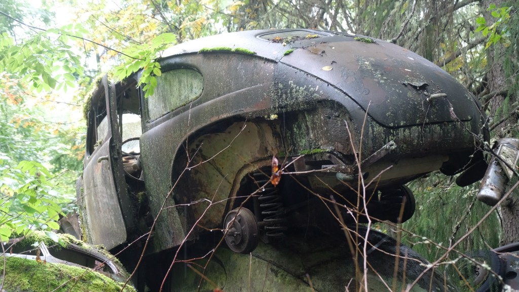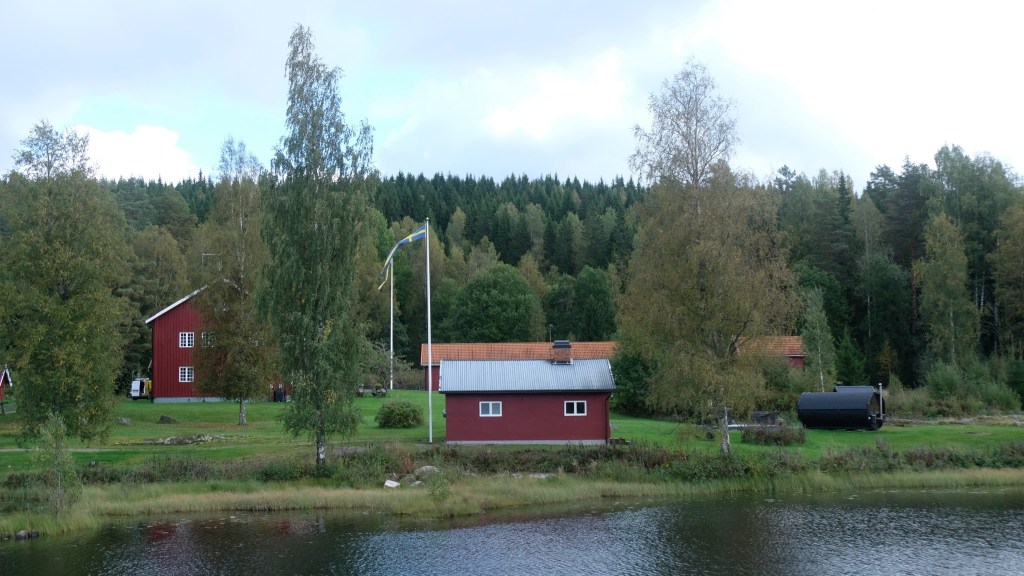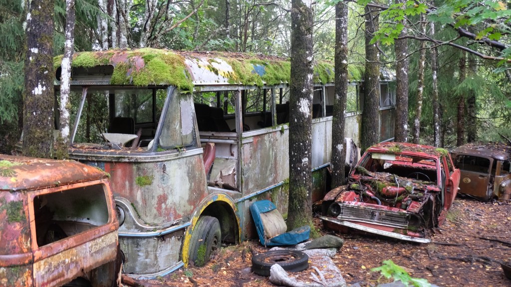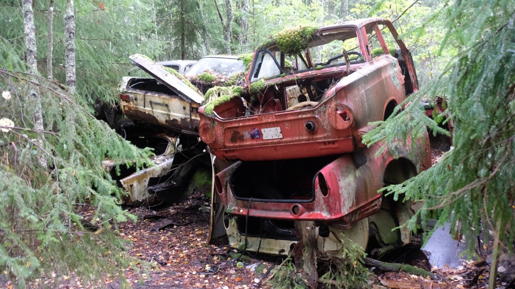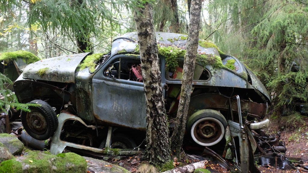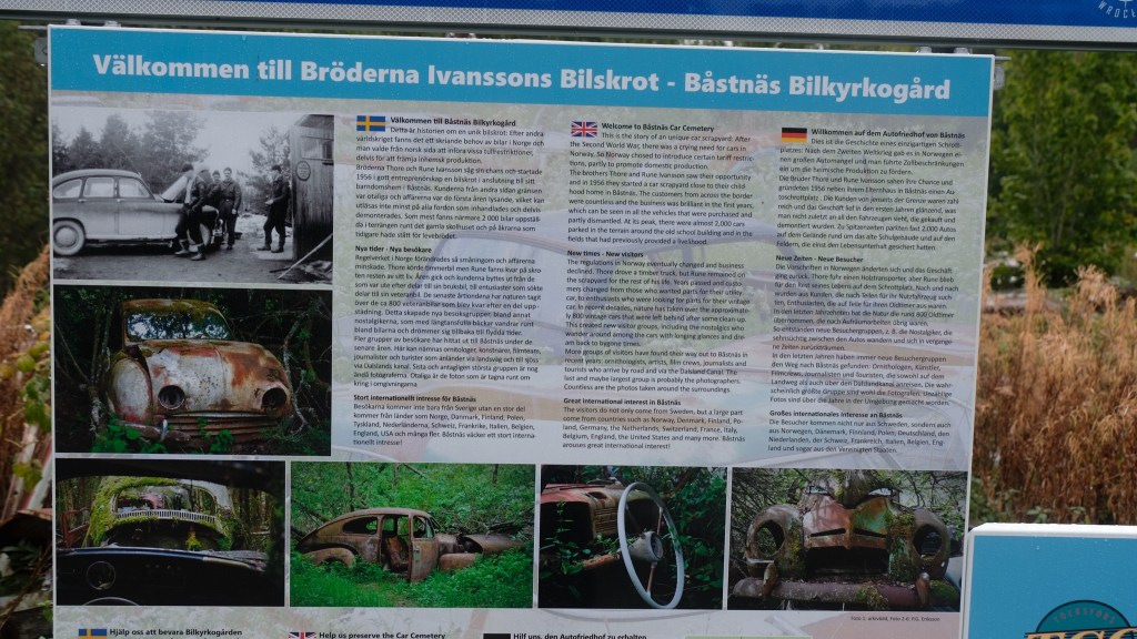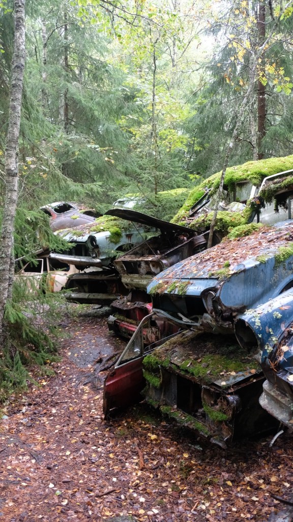 Si giunge infine con una deviazione al cimitero delle automobili di Båstnäs, diventato un’attrazione turistica. Qui dopo la seconda guerra mondiale due fratelli avevano messo in piedi un’attività per esportare macchine in Norvegia smontate a pezzi, essendo i pezzi automobilistici esenti da dazi mentre le tariffe sulle automobili erano elevate. Gli affari andarono bene fino a quando cambiò il regime dei dazi e le auto furono abbandonate. Ci sono circa 800 resti di auto sparsi su di un terreno che la vegetazione sta piano piano riconquistando. E’ talmente vasto che mi allontano dal parcheggio camminando nel bosco e non ritrovo più la direzione del ritorno senza l’assistenza del telefonino che ho lasciato in macchina…
